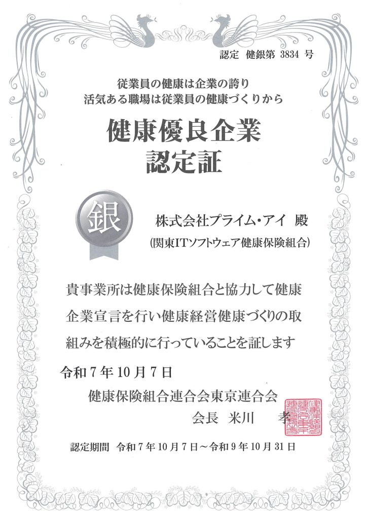 その結果、健康保険組合連合会東京連合会より2025年10月7日付で健康優良企業「銀の認定」(健銀第 3834 号)を受けましたことをお知らせいたします。